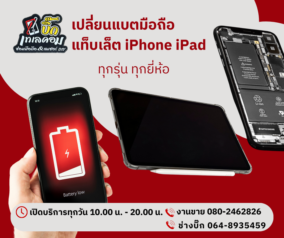แบตมือถือ iPhone แท็บเล็ต iPad แบตเสื่อม แบตบวม แบตเพิ่มความจุ เปลี่ยนแบตมาตรฐาน มอก. ทุกรุ่น ทุกยี่ห้อ